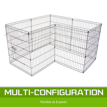 It features as 8 panels for multi-configuration which allows you to turn your playpen into different shapes. Made of durable steel frames construction with black powder coat finish provides Long Lasting Protection and weather resistance. The access door with bolt latches you can be sure that your pet doesn't have the opportunity to run away and the round edges ensure pet safety.