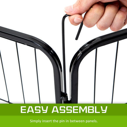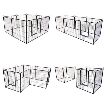 It is a multi-configuration playpen with 8 panels which allows you to turn your playpen into different shapes. The playpen is made of durable extra heavy duty steel frames construction with black powder coat finish. This fine finish provides long lasting protection and weather resistance. The access door has bolt latches and this ensures that your pet doesn't have the opportunity to run away and the round edges ensure pet safety.