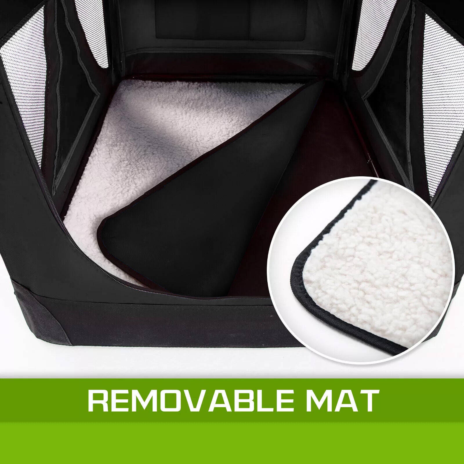The soft crate is made of high-quality non-toxic 600D polyester and is highly water resistant. This makes it very strong and increases the service life. In order to keep your pet comfortable, there are mesh windows for better ventilation, anti-frying corners with 1200D fabric with high density material and a convenient to clean removable floor mat. There are side pockets as well so you can carry your pet's toys or other items it may need during the journey. The carry handles are of high-quality and there is also a carry strap if you need your hands free! The soft crate is also foldable so if you are short in storage room, you can conveniently.