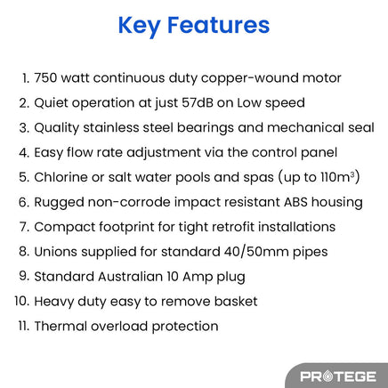 With the choice of 3 speeds and quiet and cost effective operation, the Protege PV75 represents reliability, efficiency, and innovation - making it a smart investment for any pool owner.