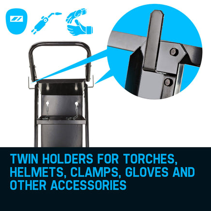 In search of the perfect weld, you should forget all worries behind and steady your hand. The Rossi Deluxe makes sure you can. With plenty of space for the welding unit, wires, rods, mask, tungsten nozzles and everything else that's required for a successful fusion, you can focus entirely on the work at hand. And you can work quickly too thanks to its solid-rubber rear wheels and nimble 360 swivelling front wheels with brake, your Rossi Deluxe is a breeze to move around the workshop.