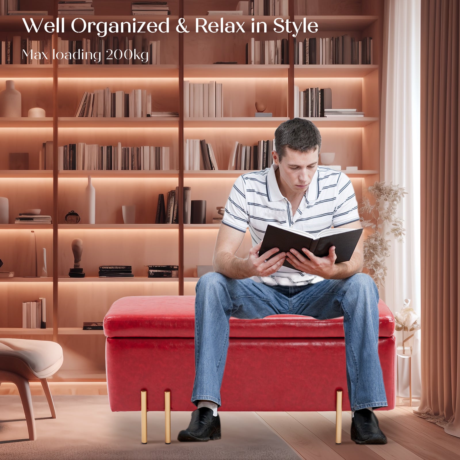 Supported by sleek metal legs, the ottoman brings contemporary charm with stability and durability. Lift the lid to reveal ample storage space for blankets, pillows, and more, effortlessly keeping your living area clutter-free.