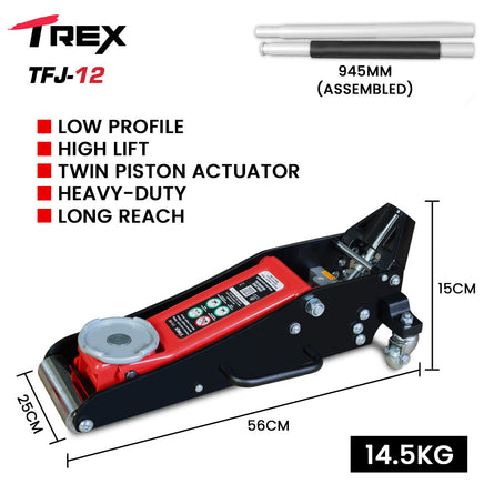 Experience the quick and easy car lifting of the Trex TFJ-12 1.2 tonne trolley floor jack. Crafted from lightweight aircraft-grade aluminium and high-quality alloyed steel. This floor jack is perfect for lowered cars. It features an 88mm clearance height for easy access and efficient handling. It reaches a maximum height of 358mm for versatile applications. Compliant with AS/NZ 2615:2016 standards in Australia, this reliable jack inspires confidence.