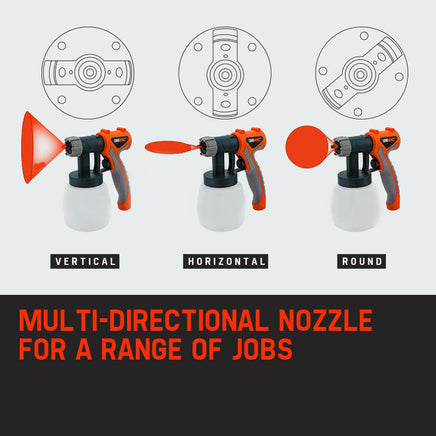 The two piece body is designed to decrease user fatigue, featuring a convenient telescopic trolley handle to make moving the motor around effortless. You simply park it next to you so your hands are kept free for spraying. One of the notable benefits of operating a High Volume Low Pressure (HVLP) system is that you dont need to lug around a heavy, costly air compressor. Moreover, the ergonomic soft-grip handle with multi-directional adjustable fluid nozzle connects to a massive 3m flexi-hose so you can flow through your DIY projects without having to move anything at all.