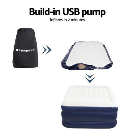 Introducing our Weisshorn air mattress, featuring a flocked sleeping surface for added comfort. Inflates in just 2 minutes with a durable pre-tested vinyl construction and seamless design. Equipped with a built-in pump for effortless operation, suitable for indoor and outdoor use.