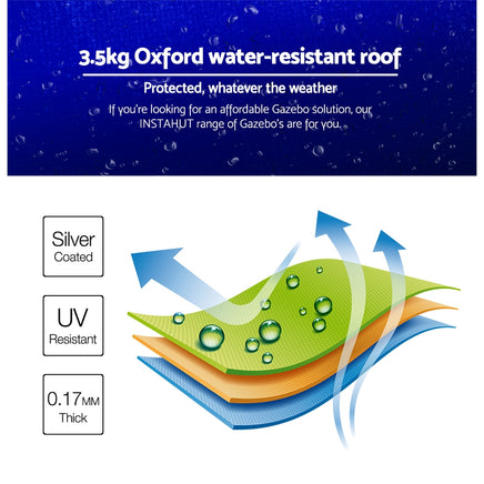 Featuring high density, long lasting PU coating oxford fabric with effective UV and water repellent treatments, this INSTAHUT 3X3 Pop Up Gazebo provides a lovely ground and canopy coverage of 300 x 300cm. It is perfect for all your upcoming outdoor activities, as a sunshade station as well as a shelter for unexpected rains.