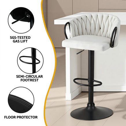 Redefine your seating experience with our single adjustable velvet bar stools. Featuring an ergonomic woven design and luxurious velvet seats, these stools combine comfort and elegance. The height adjusts effortlessly from 82-102cm, making them ideal for kitchen counters, bars, and islands. Sturdy metal construction and a reinforced gas lift cylinder ensure durability, supporting up to 120kg per stool. Designed with metal armrests and a semi-circular footrest, they offer superior comfort while protecting your floors with anti-slip protectors. Elevate your home with these stylish and functional bar stools today.