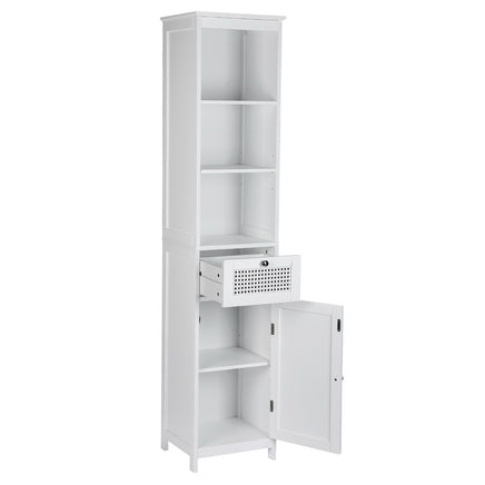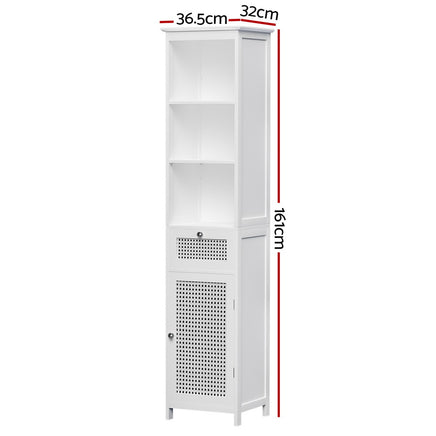 Keep your bathroom organised with an Artiss Bathroom Storage Cabinet. This neat and tidy storage solution is made from durable MDF and PVC rattan for long-lasting use. One generous drawer, a ventilated storage cabinet with two tiers and three open shelves give you plenty of room for your bathroom essentials. Smooth silver handles help you pull out the drawer and open the magnetic cabinet door with ease. The rattan cabinet doors allow for proper airflow throughout the shelves, preventing mould and bacteria build-up. The space-saving design means you can place it anywhere in your bathroom, laundry or other room with ease. Easy to install and easy to clean, the Artiss Bathroom Storage Cabinet is just what your bathroom needs to stay tidy.