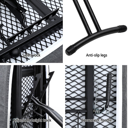 Discover our freestanding Artiss ironing board with a foldaway iron holder for convenience. Folds effortlessly for storage, boasts a robust metal frame, secure locking mechanism, height-adjustable handle, and non-slip legs for stability.