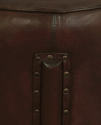 Elevate your living space with the refined elegance and timeless charm of the Heritage Genuine Leather Ottoman/Footstool. Crafted with the utmost care and attention to detail, this exquisite piece combines luxurious genuine leather with the robust beauty of solid mahogany timber, resulting in a captivating addition to any room. The Heritage Ottoman showcases a sleek, cylindrical design, enveloped in rich, supple leather that exudes sophistication and warmth. The deep, dark tones of the leather harmonize beautifully with the mahogany legs, creating a cohesive look that enhances both modern and classic interiors. Inspired by vintage charm, this ottoman features brass stud accents that add a touch of rustic elegance. The meticulous stitching and high-quality craftsmanship ensure durability and longevity, making this piece a worthy investment for your home. Measuring 44.0 x 44.0 x 49.0 cm, the Heritage Ottoman is perfectly sized to serve as a comfortable footstool, a stylish accent piece, or even additional seating when needed. Its versatile design and rich materials make it a standout addition to your living room, bedroom, or study. The Heritage Genuine Leather Ottoman/Footstool arrives fully assembled, allowing you to immediately enjoy its luxurious comfort and aesthetic appeal. Let this exquisite piece transform your space, providing both functionality and a touch of timeless beauty that will be cherished for years to come.