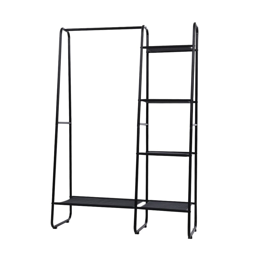 Need more clothing storage? Want a fast and easy option? Then look no further than our Metal Clothes Rack. The frame is made of sturdy powder-coated metal that can safely hold up your clothing and withstand robust use. The clothes rack has an anti-slip hanging bar and U-shaped base for extra stability so that your clothes do not end up on the floor. There are also five plastic storage shelves perfect for storing shoes, hats, folded clothes or other fashion items. The neutral black tone means the clothes rack will fit in with any d��cor and will look stylish even when left out in the open.