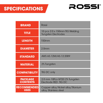Built for TIG DC welders, these tungsten electrodes deliver superior arc stability and smooth starts, especially at medium current levels. Whether youre working with copper alloy, nickel alloy, titanium, or stainless steel, Rossi electrodes provide the dependable control needed to produce flawless, high-quality welds.