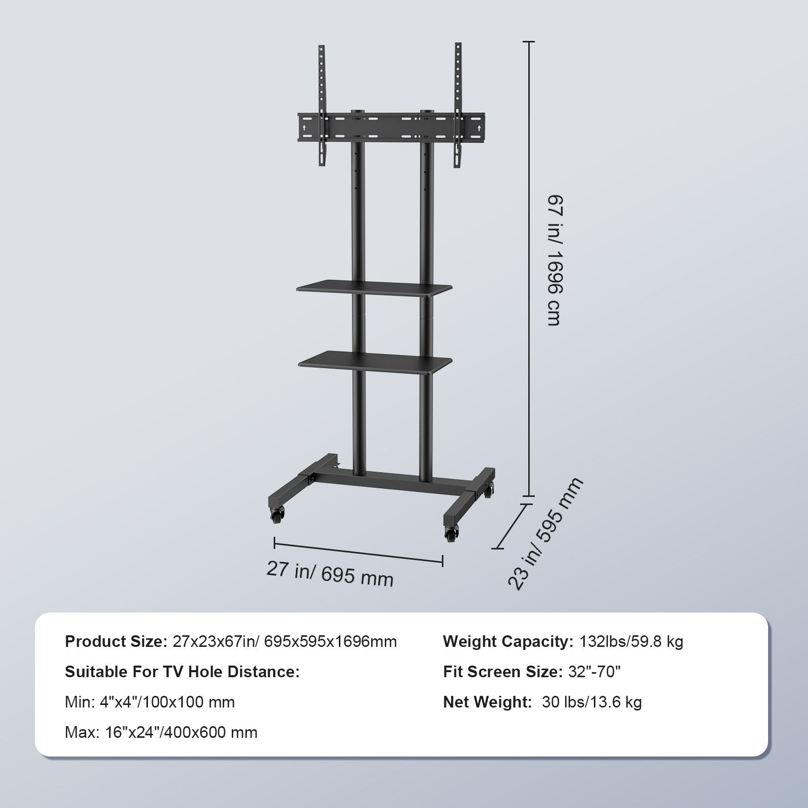 Designed to accommodate your needs, our tall TV stand mount fits 32-70 inch TVs with a weight capacity of up to 132 lbs. The VESA ranges from 100mm x 100mm to 600mm x 400mm, making it compatible with most brands of TVs.