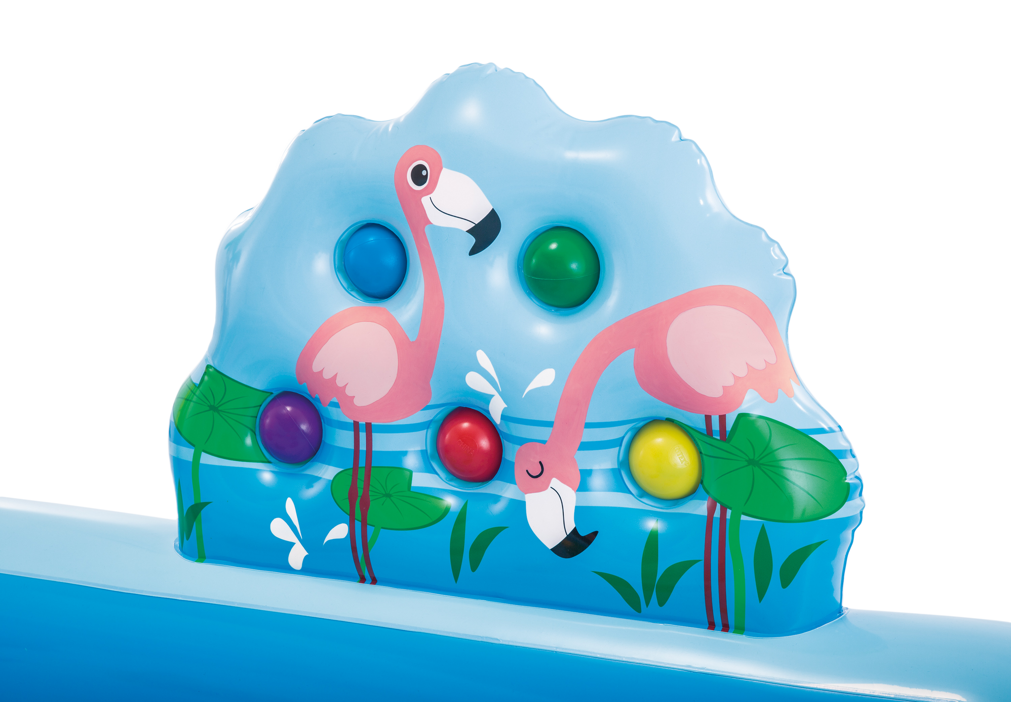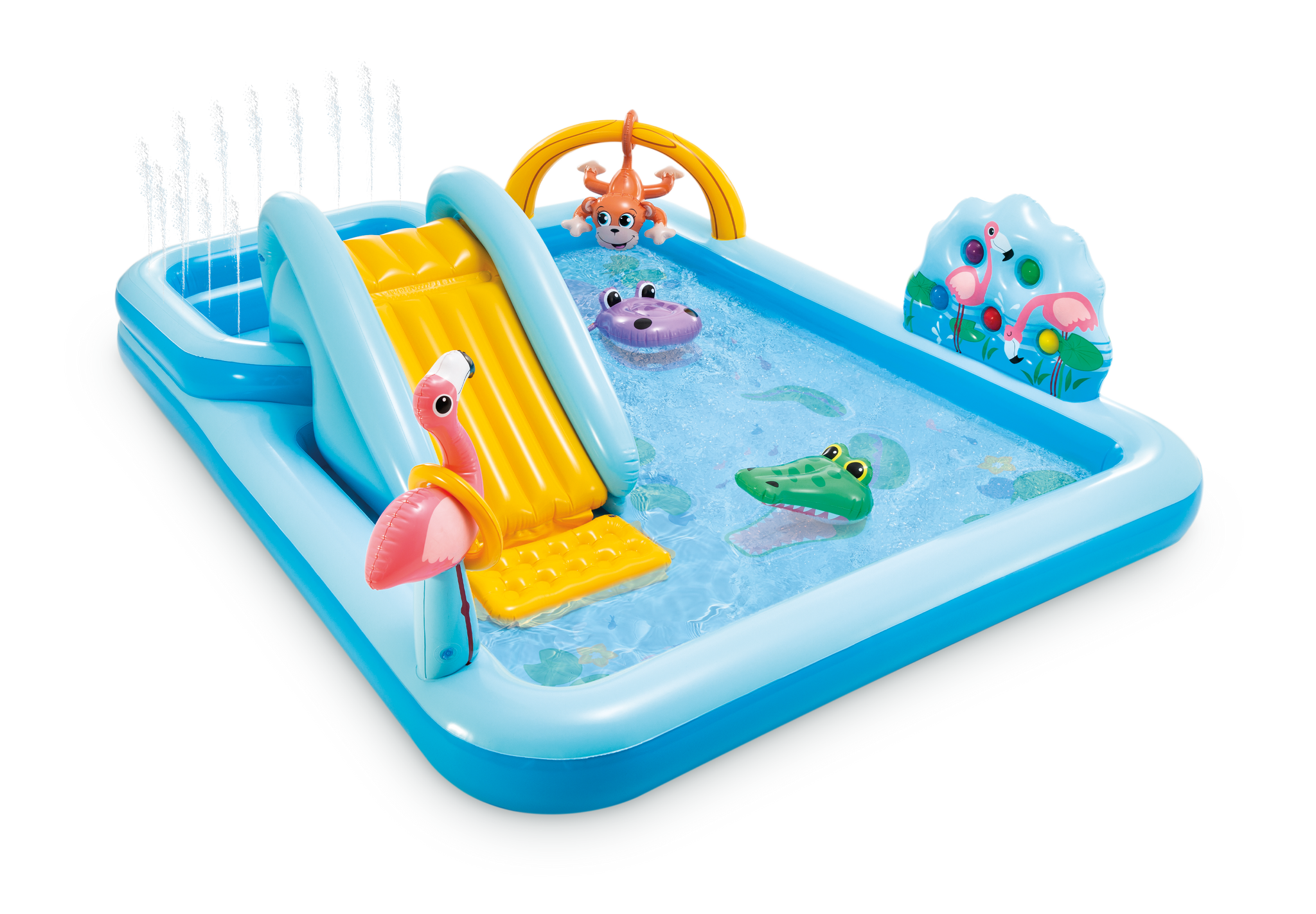 • Have lots of fun with the water slide, inflatable palm trees, flamingo and monkey