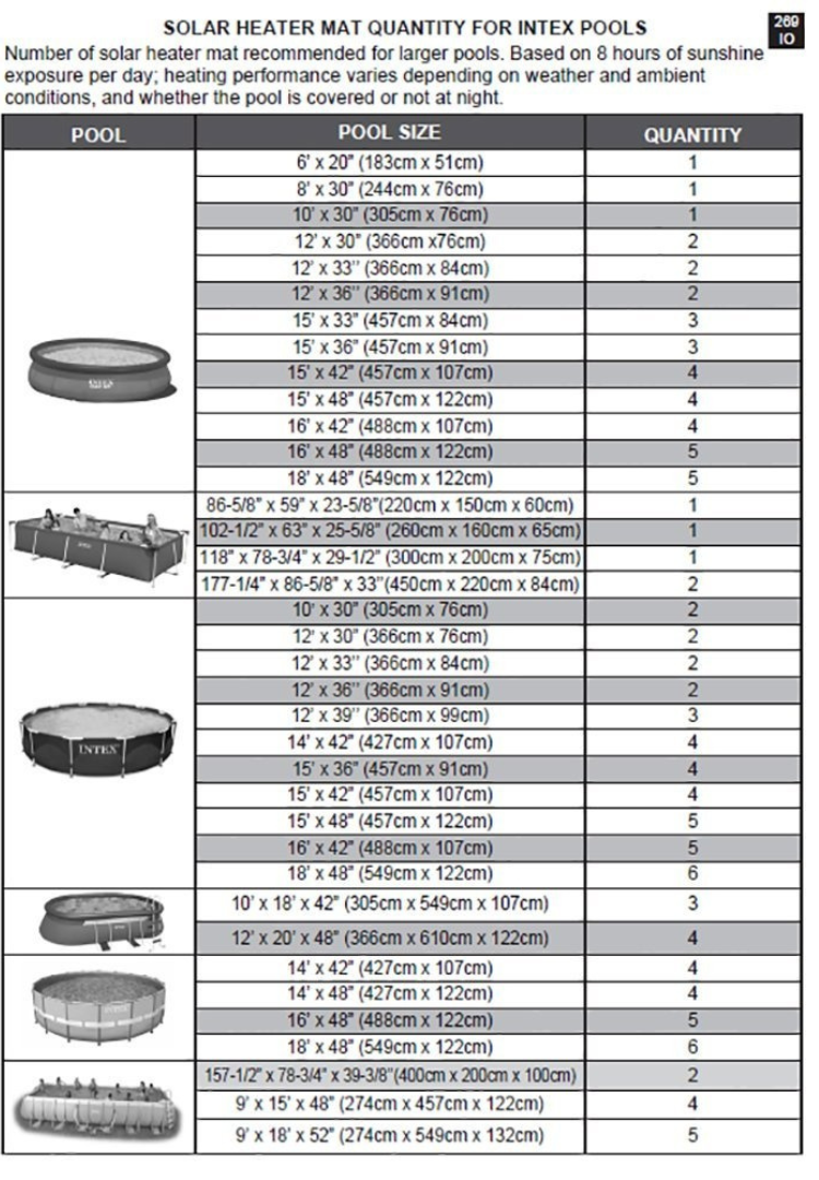 Intex Solar Heating Pool Mat 28685The Intex Solar Mat is an energy efficient way to capture the sun's rays to heat up your above�ground swimming pool. Designed to work with a variety of Intex filter pumps, this heater is�perfect for increasing your swimming session with warmer water, using environmentally friendly�solar heating technology.Details: