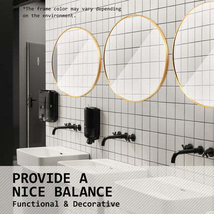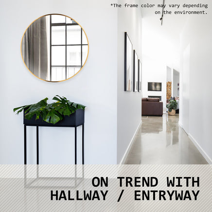 Please note it's neither brass gold nor rose gold. Our aluminum mirror, part of the gold color theme, has a unique shade within the gold spectrum. The frame color may vary with light due to aluminum's reflective nature.