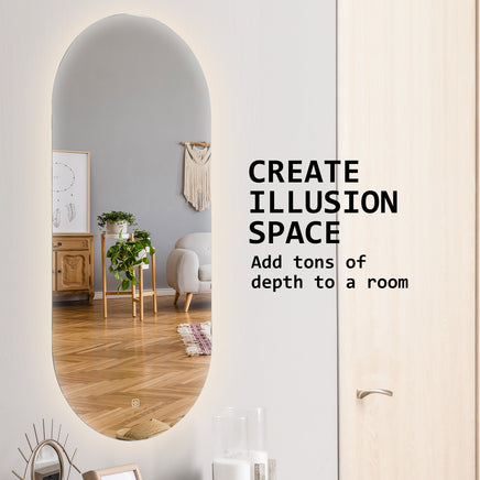 The LED oval mirror is sleek and frameless in design comes with an energy-efficient LED light strip place around the back of the mirror. This illuminated mirror besides saving more energy and cost than light bulbs, but also has a long-lasting lifespan of up to 50,000 hours. Not to mention it combines dual-channel LEDs greatly affect aesthetics and ambience. You can adjust its colour temperature range from a mix of warm yellow and cool white LEDs and cross-dim between the two with a simple long touch.