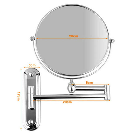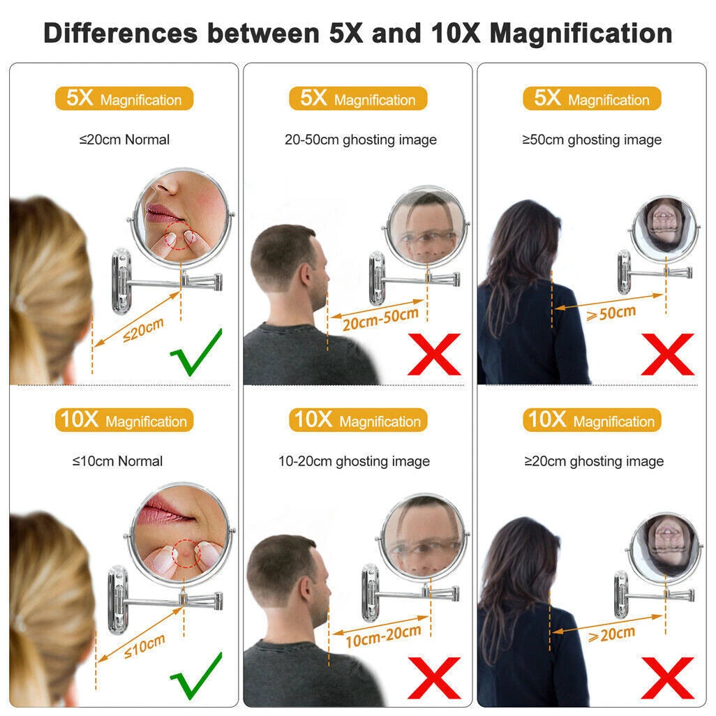 This double-sided wall-mounted mirror features 1X and 10X magnification, delivering a clear, detailed view for makeup, shaving, or skincare. The extendable arm adjusts up to 30 cm, making it suitable for users of different heights and setups.