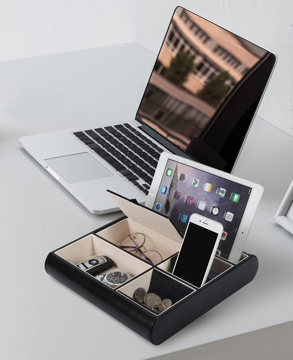 Valet Tray Leather Multi Catch Storage Box for Jewellery Accessories, Keys, Phone, Wallet, Coin, Jewellery (Black)