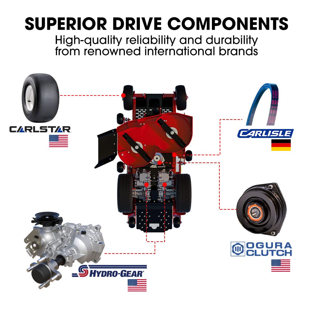 - Premium Hydro-Gear hydrostatic pump imported from the U.S. for smooth, commercial-grade drive performance