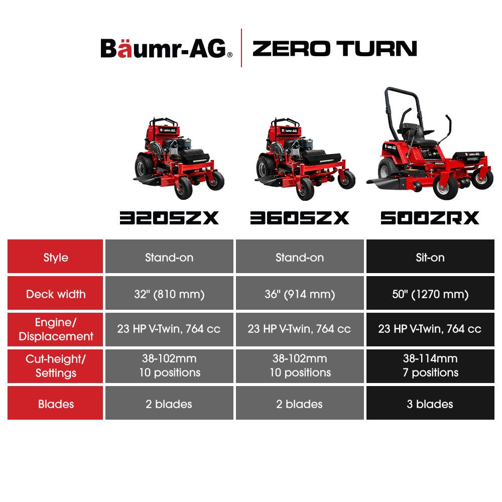 The Baumr AG 500ZRX zero-turn ride-on mower is engineered for fast, efficient mowing across large lawns and properties. Its wide cutting deck and responsive handling help you cover more ground with less effort.