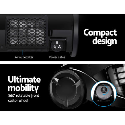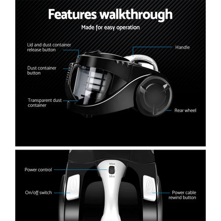 The convenience of bagless vacuuming with the power of effortless cleaning. Such is the Devanti Bagless Vacuum Cleaner that makes light work of even the toughest cleaning tasks. With its 2200W suction power, the vacuum cleaner utilizes a multi-cyclonic system that separates large debris from fine dust. The dust is filtered through a HEPA filter that eliminates up to 99.97% of allergens. Clearing the dust is an easy matter of pressing the release button to remove the lid and dust container and pouring the contents away. The HEPA filter is also washable and reusable. The vacuum cleaner comes with a retractable cord for easy mobility, a 360° rotatable hose and a telescopic stainless steel handle that can be fitted with different heads included in the accessories pack.