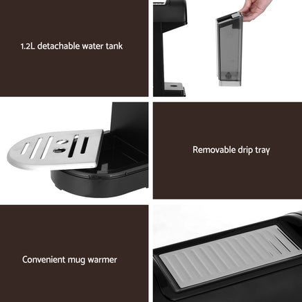 Get a head start on the day with your first cup of coffee from a Devanti Espresso Machine. Pour the perfect shot every time with easy-to-use controls, a powerful 20-bar pressure pump, and an instant heat system. The machine comes with single and double-shot coffee filters, a diecast aluminium portafilter and a dual coffee tamper/spoon - everything you need for a fresh cup. The convenient mug warmer keeps your cups at the perfect temperature as you froth your milk just the way you like it. Easily fill the machine from the removable water tank and clean it with the removable drip tray. Its space-saving design won't take up your entire benchtop, giving you plenty of room for your other kitchen essentials. Relax and enjoy your favourite coffee from the comfort of your home with your very own Devanti Espresso Machine.