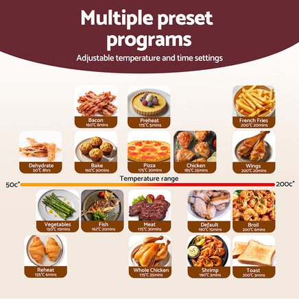 Cook smarter with the Devanti 13L Air Fryer Oven. With a large touch display and 17 pre-set programs, it makes cooking fast and easy. Enjoy crispy results with 360?? hot air circulation and adjust temperatures from 50??C to 200??C. Features include a 90-minute timer, basket shake reminder, touch controls, and dishwasher-safe parts. Comes with a free non-stick crisping tray and is SAA approved.