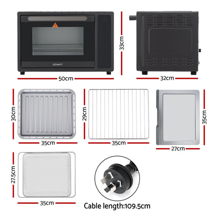 Conquer culinary creativity with the Devanti Air Fryer! This powerhouse boasts a massive 32L capacity, perfect for family feasts or meal prepping. Effortlessly choose from 16 pre-programmed settings for everything from crispy fries to perfectly roasted vegetables. 360 air circulation ensures even cooking and delicious results, while the adjustable temperature range (35?-200?) and 90-minute timer allow for precise control over your cooking. Keep an eye on your food with the built-in light.The intuitive sensor touch control panel and cool-touch handle offer user-friendly operation, while the non-stick coating pan and heat shield vent prioritize safety and convenience. This air fryer comes complete with a bonus accessory kit, including an air fry basket, drip tray, oven rack, and crumb tray, providing versatility for all your air frying needs.