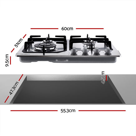 Whether it is for your existing or new home, our Devanti 60cm Gas Cooktop is just the right thing you need for easy, no-fuss cooking. Loaded with an extensive list of chef-friendly features such as an easy ignition system, easy-to-use powder-coated knob controls with safety lock and a flame failure safety device, the cooktop is also incredibly sleek with its stainless steel surface. It features four burners including two semi-rapid burners, one wok burner and one auxiliary burner, all with various power levels to choose from to prepare that perfect dish. The solid cast iron grates hold up your pots and pans perfectly steady and are longlasting and heat-resistant as well. And a pan support is included for use with the auxiliary burner to prevent tiny pans from tipping over and messing up your cooktop. The cooktop is factory set for natural gas but is compatible with LPG once the included LPG conversion kit is installed. Powerful and yet integrally safe, the cooktop promises many moments of hassle-free delicious cooking with the right blend of sophistication and class for your kitchen.
