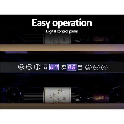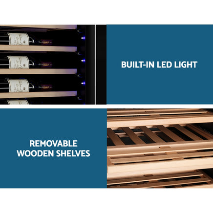 Need a reliable way to store your wine collection? Look no further than our Devanti Wine Cooler. Utilising the latest high-precision compressor cooling technology, our wine cooler ensures your favourite vintages are well kept at their recommended temperatures with its circulated cool air. The cooler has a dual zone system with two separate temperature-controlled zones, ensuring perfect cooling temperatures for both white and red wines. The temperature can be set between 5? and 13? for the upper zone (which is suitable for dry white and sparkling wines), and between 12? and 18? for the lower zone (which is suitable for red wines). The digital control panel makes for easy temperature adjustments while the built-in LED lights help you to see your wines in the best light. The stylish design stores up to 128 bottles of wine in a neat and tidy wood shelving system. Better still, the double-glazed glass door is UV-resistant and provides excellent insulation. The ensemble works quietly and efficiently and has a built-in lock for total peace of mind. Suitable for both home and commercial use. Treat your vintage collection with the care it deserves - invest in a Devanti Wine Cooler today.