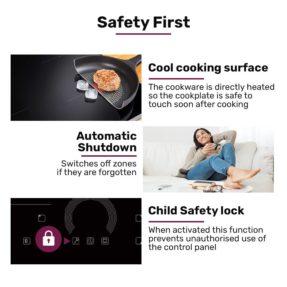 Safety features include an auto-safety shutdown, a child lock function, and the surface cools soon after cooking for peace of mind and easy cleaning. With advanced EuroChef Induction technology youll be inspired to release your inner Masterchef!