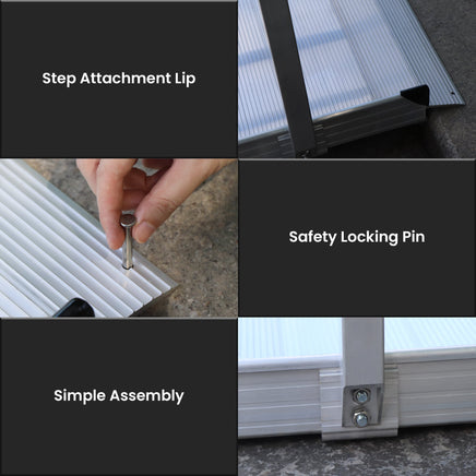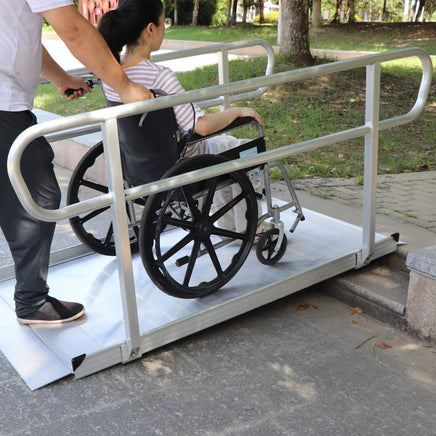 Provide safe and convenient access for wheelchairs, scooters and walkers with this robust aluminium wheelchair ramp. Suitable for indoor and outdoor environments, it is equipped with strong safety handrails and a non-slip grooved surface that ensures a secure grip, ensuring safe passage even in wet weather. Its pre-drilled holes make semi-permanent installation on thresholds and buildings a breeze. With an impressive load capacity of 386kg (850 lbs), it supports a variety of mobility devices, providing reassurance for all users. Whether intended for home use or public areas, this ramp facilitates smooth and secure transitions, improving accessibility and independence. Perfect for those seeking durability, safety and reliable performance in any situation.