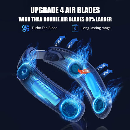 - 4 Fans Design-With the help of innovative four turbo fans and a total of 68 large-diameter air outlets, the neck fan increases the air volume by 100%, providing powerful and steady wind. Airflow comes out both upward and downward, which achieves rapid cooling of the neck and face