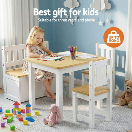 The kids table, chairs and storage bench work together to keep activities organized while helping reduce clutter in kids' rooms or shared spaces. Its child-sized design supports comfortable seating and independent use.