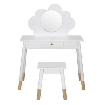 The Keezi Kids Dressing Table is perfect for kids on the go. Featuring a detachable top mirror and an easy-to-use storage drawer, the vanity has everything you could want for your child to play pretend or get ready for the day. Made from quality painted MDF board atop solid rubberwood legs, the vanity is easy to maintain and will stick with your children for years to come. The top cloud motif will spark your little one's imagination. The drawer has an easy-grasp handle and good storage capacity to fit everything from makeup to fashion accessories. Constructed with safe rounded corners and edges, the table and chair set is absolutely safe for use by your child and designed to handle robust use with its strong weight capacity. Your child will love getting ready at their new Keezi Kids Dressing Table.