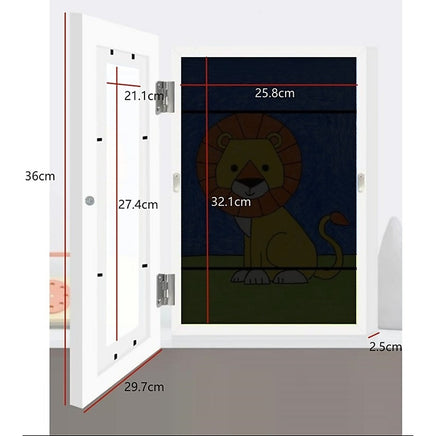 Our art frame boasts a 36 x 29.7cm outer border and a 32.1 x 25.8cm inner border, offering an ideal display size for small artworks. It can comfortably store anywhere from 50 to 150 artworks, depending on paper thickness. Crafted with care, our children's art projects feature high-quality glossy acrylic sheets and environmentally friendly MDF frame molding, ensuring a clear view and an artistic ambiance for your pieces.