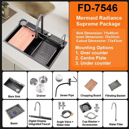 SPACE-SAVING:This kitchen stainless steel kitchen sink adopts the inner wall sliding design, and there are double-layer sliding tracks on both sides of the inner wall for sink accessories, so as to achieve the largest working space of the waterfall kitchen sink. Our kitchen sink set also includes: solid wood cutting board, nano pot in pot, triangular drain basket, sink glass rinser.