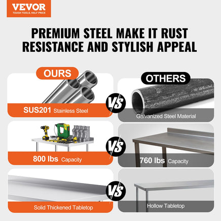 This work table, measuring 24 x 48 x 40 inch, is made from SUS201 stainless steel for the tabletop, shelves, and legs. It offers superior rust resistance, a sleek appearance, and a smooth surface that is easy to clean with a simple wipe. NSF certified, it meets strict public health standards, ensuring long-lasting protection for your health.