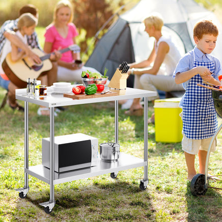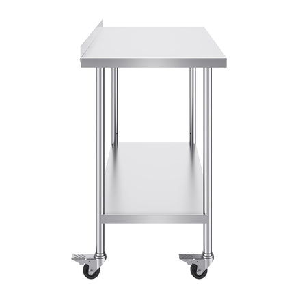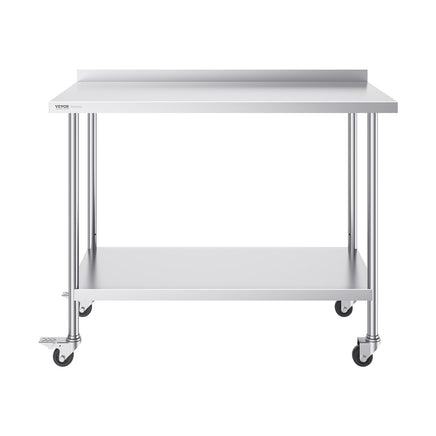 Featuring 3-level adjustable shelves, this work table offers the most user-friendly and practical functionality. Simply adjust the shelf height with screws to accommodate items of different sizes. Equipped with 4 swivel casters, including 2 with brakes, the table remains stable and can be easily moved to any location. The high rear backsplash prevents items from falling off and guards against water splashes.