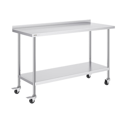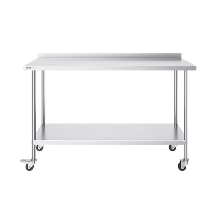 Featuring 3-level adjustable shelves, this work table offers the most user-friendly and practical functionality. Simply adjust the shelf height with screws to accommodate items of different sizes. Equipped with 4 swivel casters, including 2 with brakes, the table remains stable and can be easily moved to any location. The high rear backsplash prevents items from falling off and guards against water splashes.