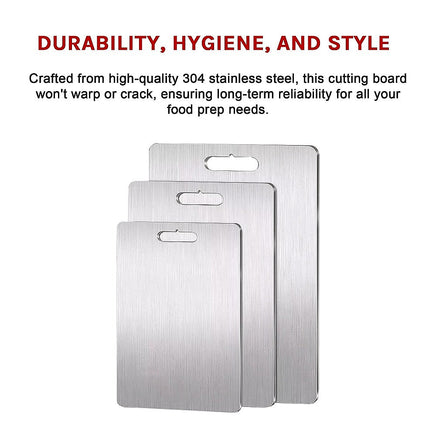 Built for durability and hygiene, this 3-piece 304 stainless steel chopping board set features a sleek, non-porous surface that won't absorb odours or stainsperfect for clean, precise food prep in any kitchen.