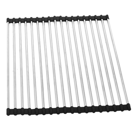 - Foldable dish drying rack. Constructed of stainless steel bars and a flexible silicone frame allowing you to fold it up tightly for storage. Stainless steel bars make it hygienic and easy to clean. Strong enough to hold dishes or pots and pans.