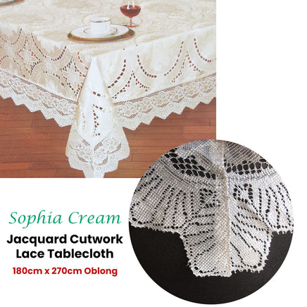 Elevate your dining experience with the Sophia Cream Jacquard Cutwork Lace Tablecloth 180 x 270 cm. This elegant tablecloth features a luxurious jacquard design enhanced by intricate cutwork lace detailing. The soft cream colour exudes sophistication, making it perfect for both formal gatherings and casual meals. Made for style and durability, it's a timeless addition to your table setting. 180cm x 270cm Oblong - 6 to 8 Seaters.