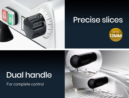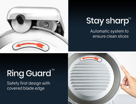 With a safety first design, fingers are shielded with the RingGuard™ system, and the large baffle serves a protective barrier. The solid base and non-slip feet also combine to deliver safe handling and control. The aluminium base is rust free and the entire unit is easy to keep clean. Precise thickness control lets you adjust from wafer-thin slices to 13mm cuts making it not only suitable for cold meats, but also for cheese, fruit and vegetables.