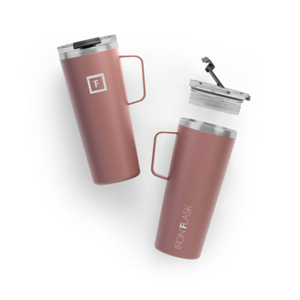 Iron Flask Grip Coffee Mug, Rose Gold, 24oz/700ml. For the days that require an extra oomph, there s the Iron Flask 24 oz Grip Coffee Mug, which comes in a variety of colorful powder coatings for strength and style. Iron Flask s travel coffee mugs are made with double-walled, vacuum-insulated stainless steel to keep your Ethiopian Ghimbi or London Fog nice and hot for four hours with no mug sweat. Plus, it s 100% leak-proof, so you never waste any of that precious, precious oomph.
