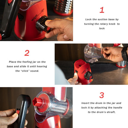 - Three Interchangeable Stainless Steel Drums: Includes fine grater, coarse grater, and straight slicer for versatile food preparation.
