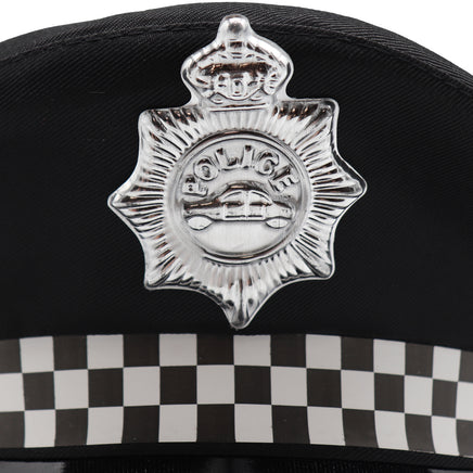 Command respect and complete your law enforcement uniform with our Police Officer Cap. Designed to mimic the headgear worn by real police officers, this cap features a classic black finish with a traditional checkered band that denotes authority. The front is adorned with a striking silver badge emblem.. Constructed with durable materials, it includes a glossy black peak that provides a sharp, professional appearance. The cap is ideal for costume events, theatrical performances, or as a part of a collection.