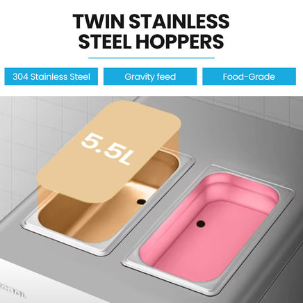 - Twin 5.5L food-grade stainless steel hoppers with gravity-fed system