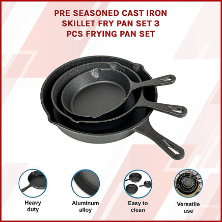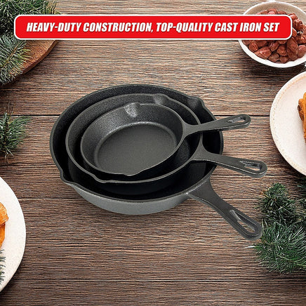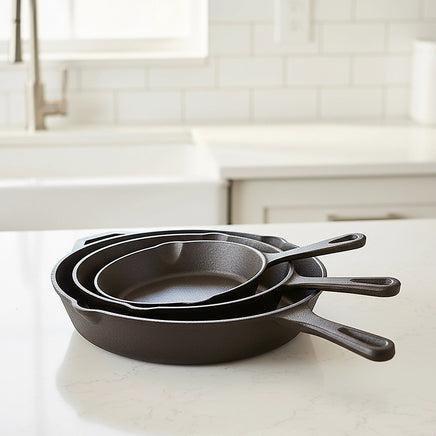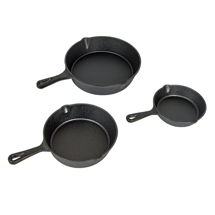 This top-quality cast iron set will become a treasured heirloom, passed down from one generation to the next. Cast iron is as sturdy as you can get almost unbreakable. Just season it again after you use it a few times at least several times a year. Rub it all over with oil after each use, and it will give you and your heirs years of use. Cast iron's high heat retention and even cooking capabilities, even at high heat, will make this set of pans your daily go-to for fried chicken, pan-seared steaks, cornbread, one-pan dinners, pancakes, and more. Saute, fry, grill, or even bake whether on your barbeque grill, in your oven, or on top of your stove. Their rugged construction makes them perfect to take along on camping trips, too. Start your own family tradition of great cooking today. Buy your set now!